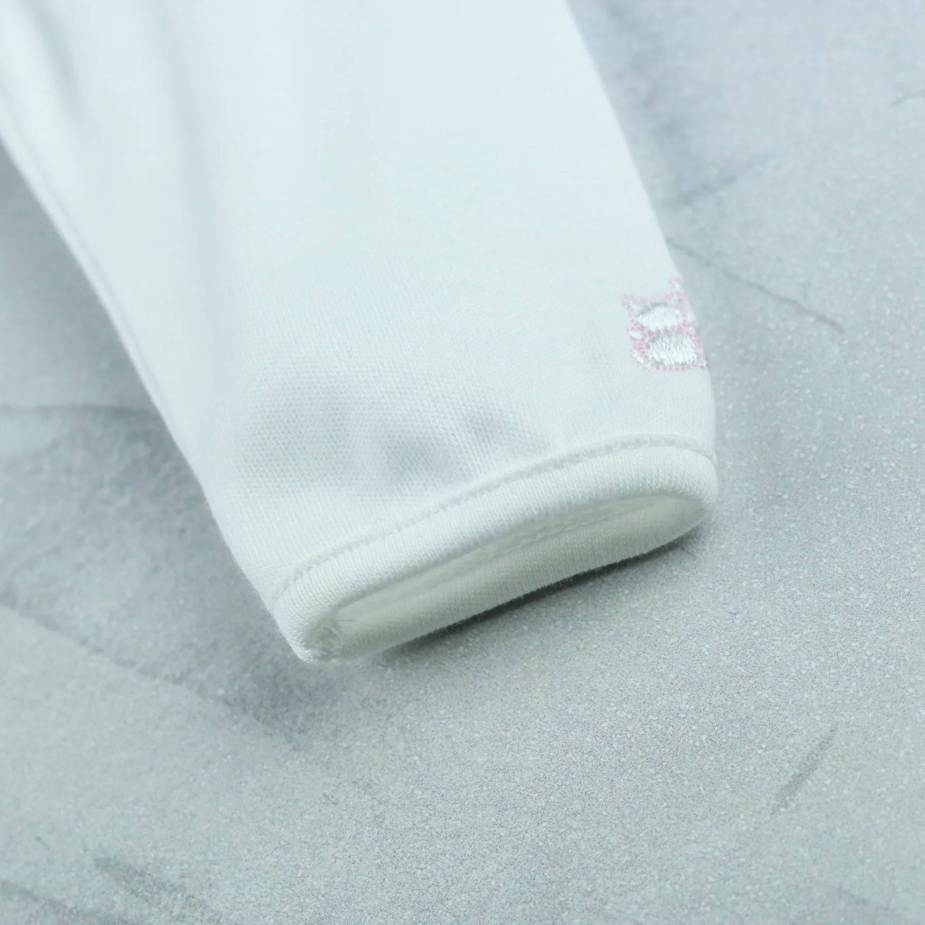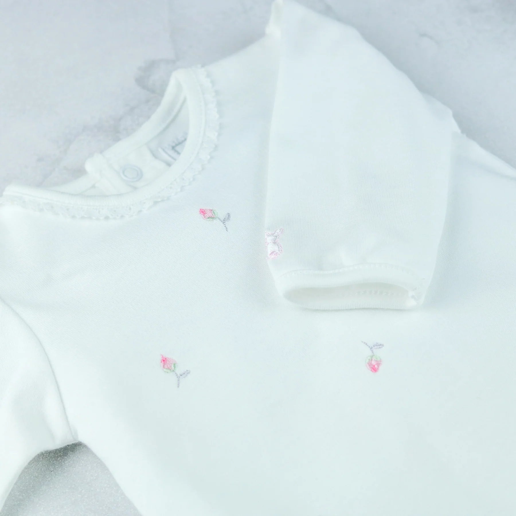 A gorgeous baby girls white babygrow with a delicately laced edge neckline, which harmonises effortlessly with detailing on the ankles. Beautiful rosebud embroideries are scattered across the rest of the garment. A perfect new baby gift.