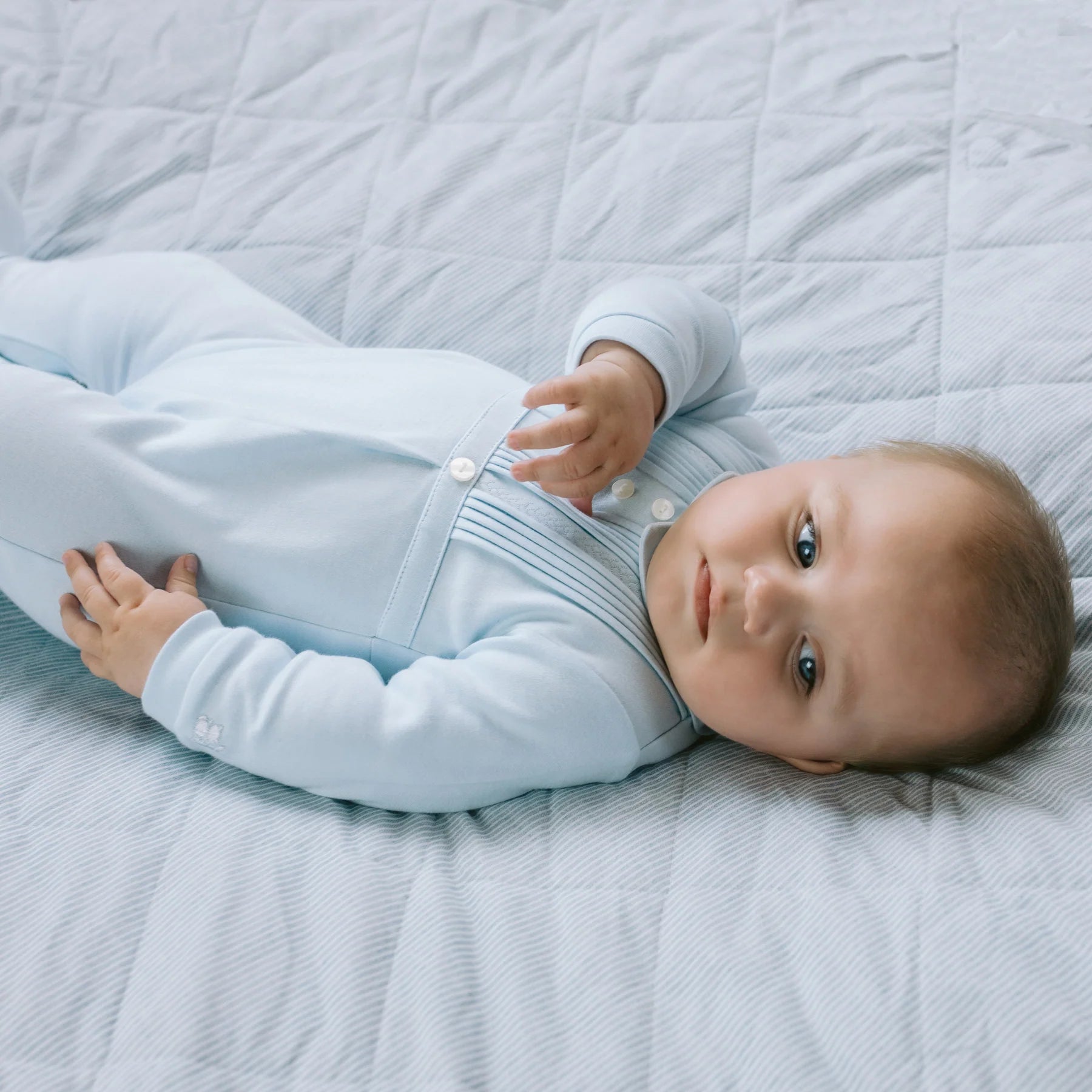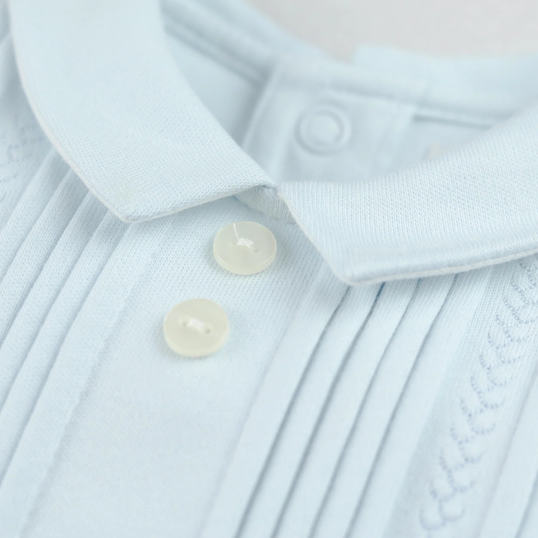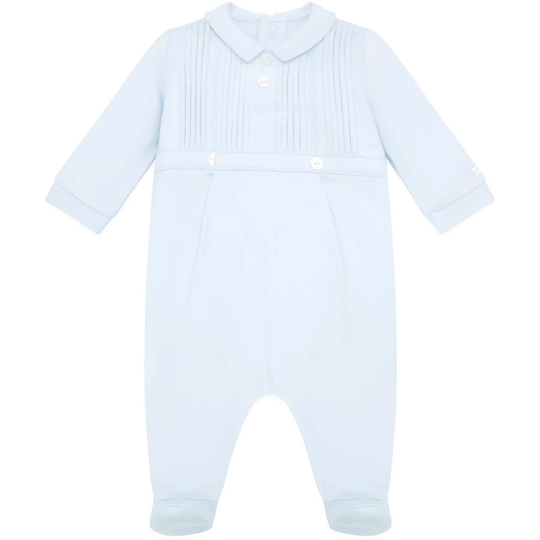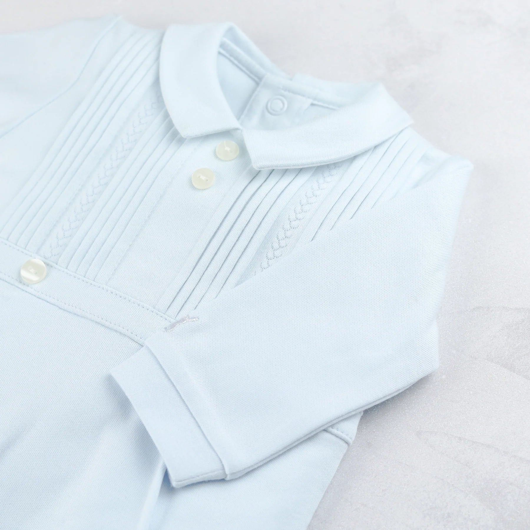 A truly classical baby boy’s babygrow, in soft blue cotton, Jimmy is the perfect outfit for a new baby. Subtle features include a gorgeous little collar, pintuck pleats and contrasting vertical feather stitch from just below the collar to the buttoned waist.