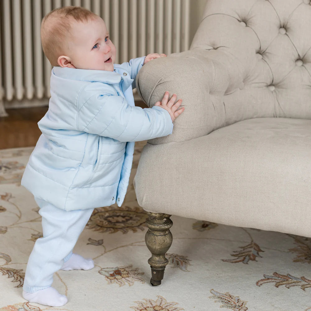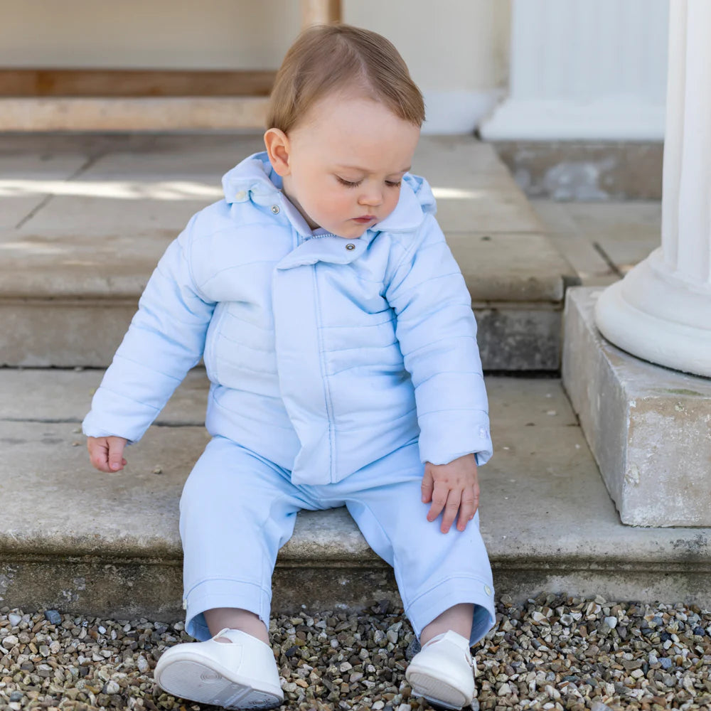 Cosy, practical for chilly winter months is this baby boys pale blue jacket, a classic Emile et Rose piece. Designed to keep baby warm this winter the jacket comes with coordinating detachable hood and mittens and a fully concealed zip opening. The jacket is fully padded and has soft jersey lining. This piece includes smart styling of horizontal stitch quilted effect very smart!