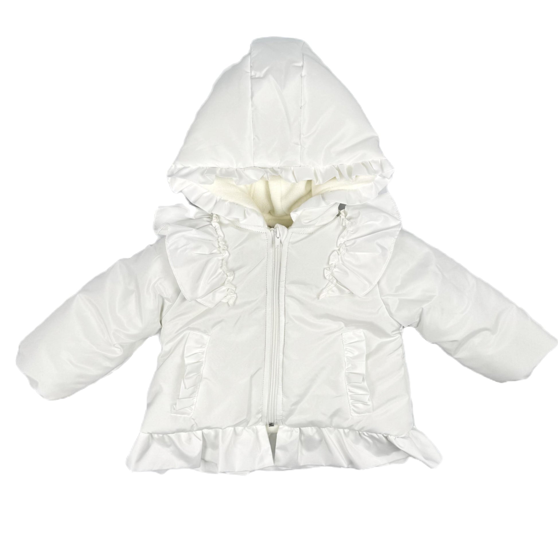 The Girls White Frilly Jacket Emma is a beautifully crafted outerwear piece designed to combine elegance with comfort. Made from high-quality, soft fabric, it features delicate frills that add a charming, feminine touch, perfect for special occasions or elevating everyday outfits. This jacket offers a lightweight warmth ideal for transitional weather, ensuring your child stays cozy without overheating. Its classic white color makes it versatile and easy to pair with various dresses or casual wear, while expert tailoring guarantees a flattering fit that allows freedom of movement. A stylish and practical choice for any young girl's wardrobe.