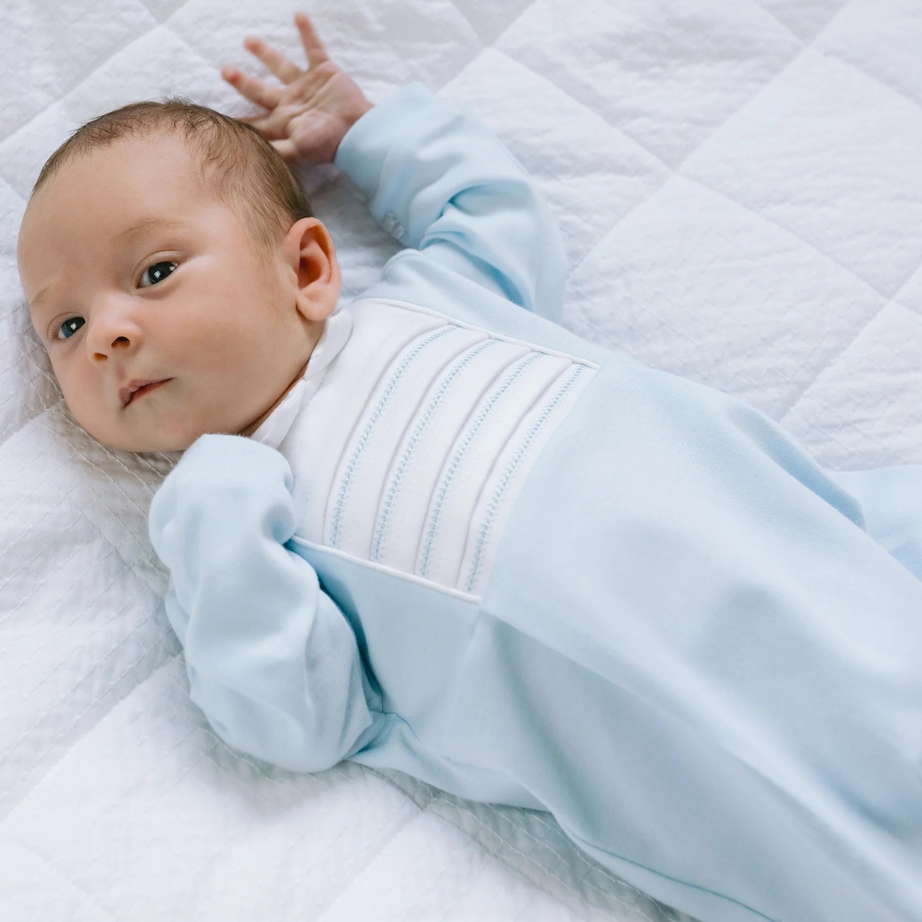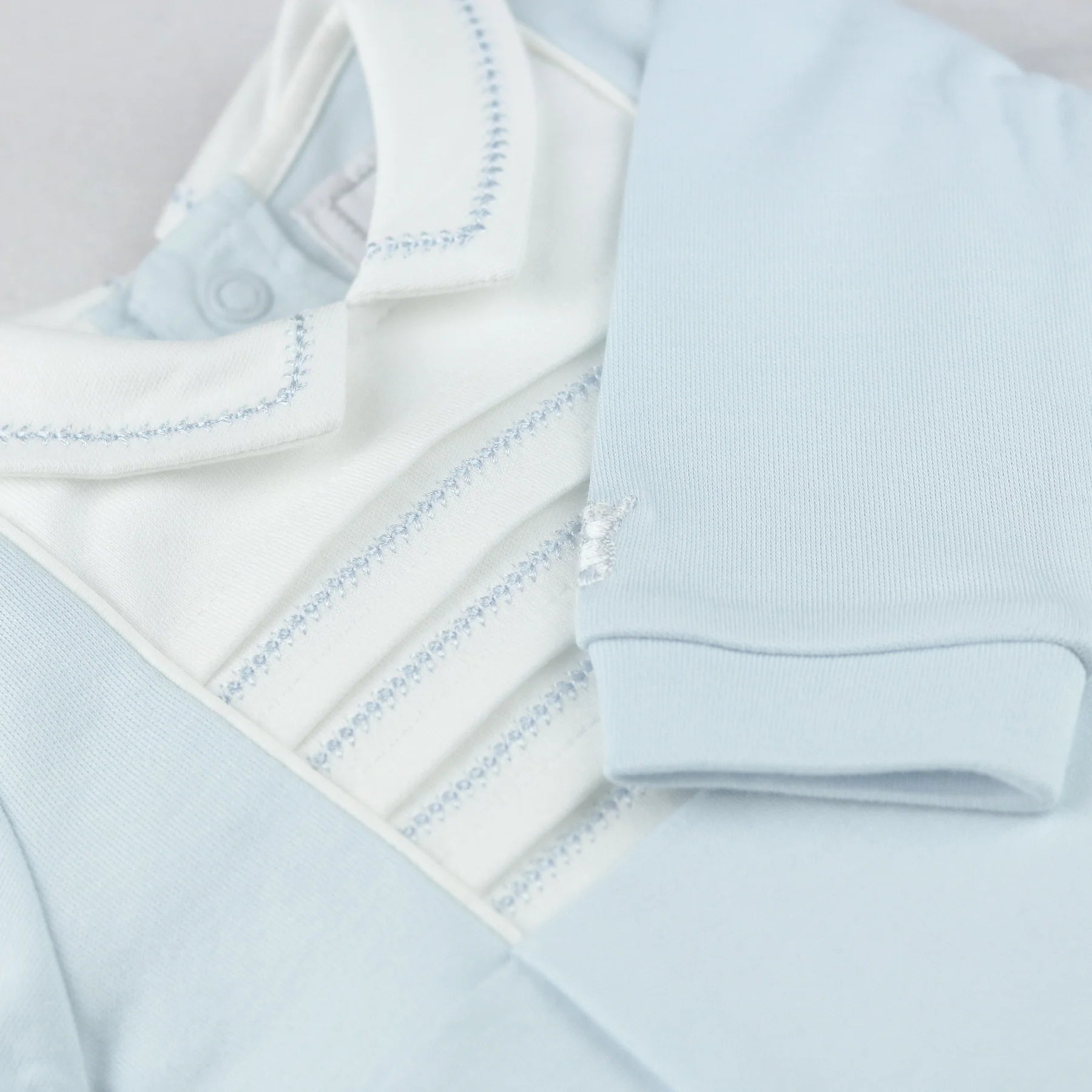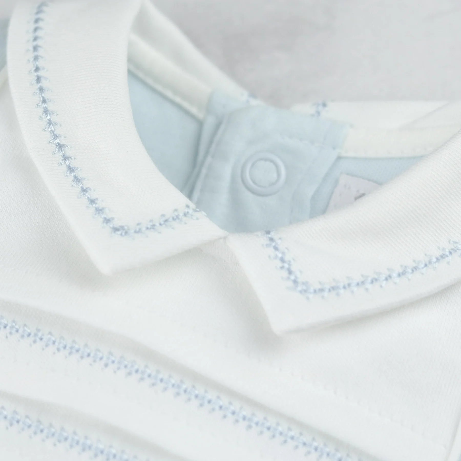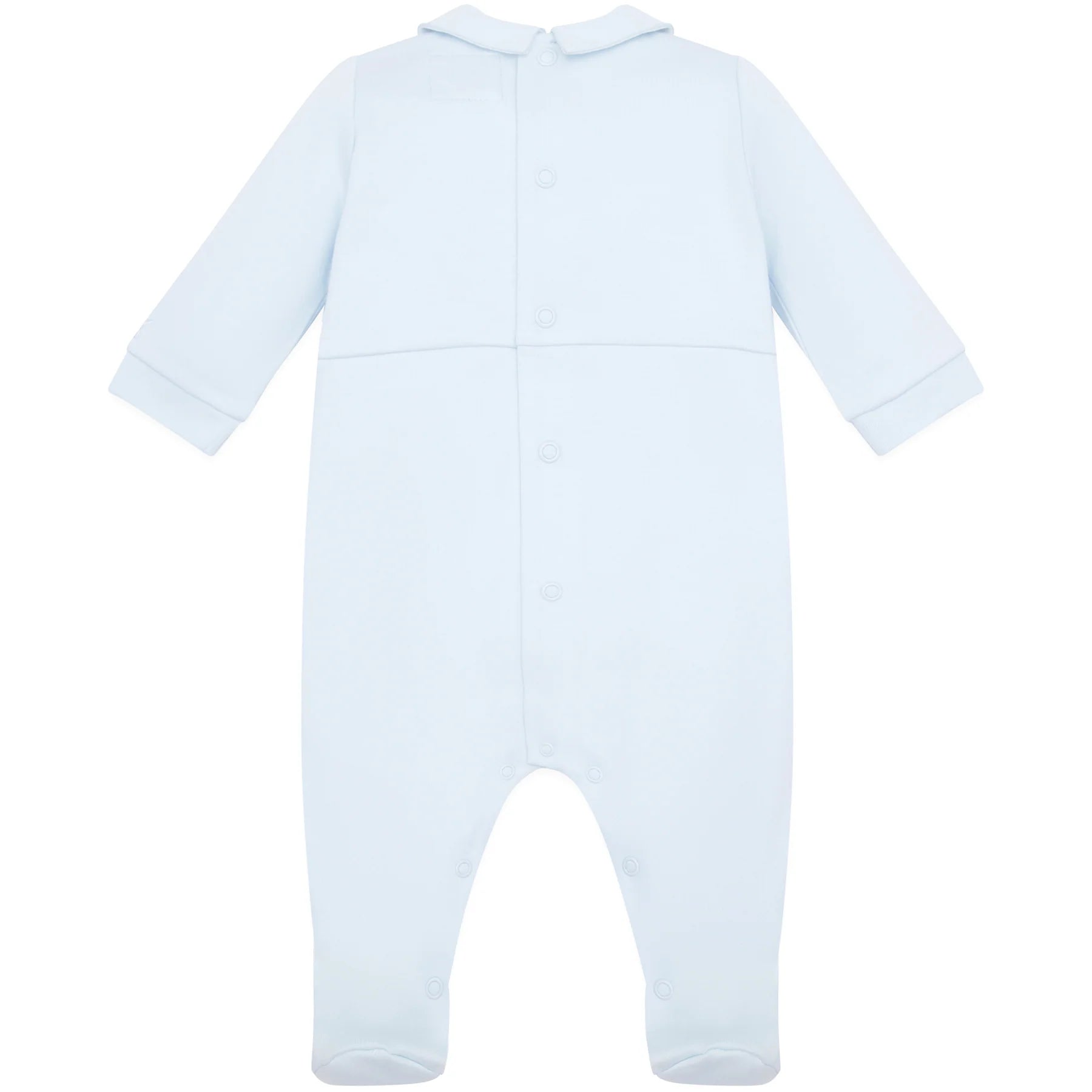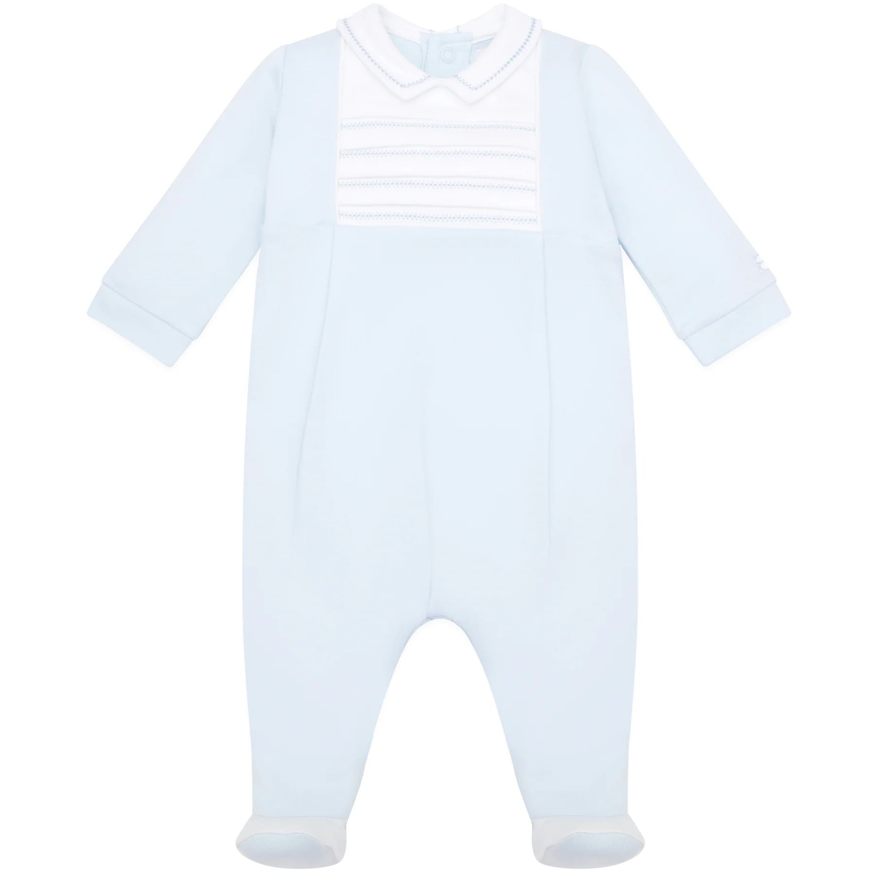 Jack is a traditional baby boys babygrow with a certain smartness. Within a square inserted yoke, neat horizontal pin tucks and herringbone embroidery to the centre piece, are the main features of this garment. A crisp white collar with a blue outline embroidery and white feet, finish off this perfect little garment for any occasion.